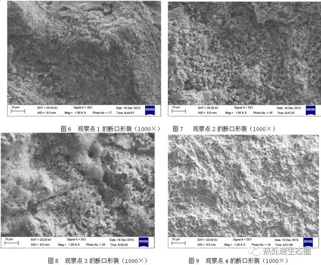 從圖6、圖7和圖8可見,裂紋斷口的氧化物清理后呈現一種疏松(豆腐渣形)的斷口形貌,與疲勞斷口和靜斷斷口有明顯的不同。