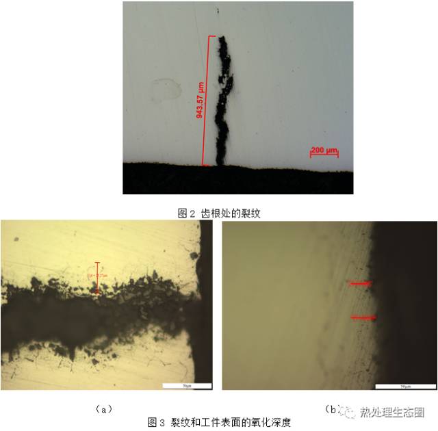 從主裂紋上取樣,制樣后在顯微鏡下(100×)觀察裂紋,發現沿齒根處的裂紋,其深度0.94mm,見圖2。裂紋及工件表面有氧化現象,見圖3。裂紋處的氧化深度(25.27μm),見圖3a。比工件表面的氧化深度(31.65μm)略淺,見圖3b。