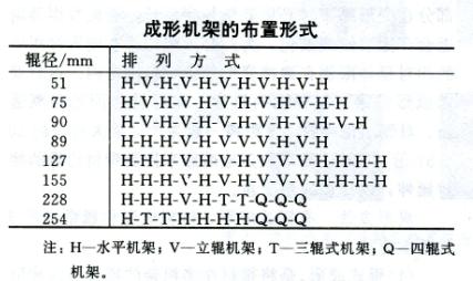 成形機(jī)架的布置形式(見表)有:(1)水平輥與立輥交替配置;(2)在閉口孔前設(shè)置成組的立輥機(jī)架。因后者更好地利用了立輥的優(yōu)點(diǎn),所以采用日廣。