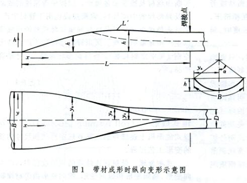 成形原理 帶材在連續(xù)彎曲成形過程中,產(chǎn)生橫向變形、高向變形和縱向變形。橫向變形指帶材橫斷面在各機(jī)架上的彎曲變形,它取決于孔型設(shè)計(jì)。高向變形是成形前后的厚度變化,此值很小一般不計(jì)。縱向變形是指帶材彎曲成管筒時(shí),在軸線方向上帶材邊緣的變形,它決定著成形質(zhì)量。圖1為帶材成形過程中縱向變形的示意圖。如圖所示,在變形區(qū)內(nèi)帶材邊緣長(zhǎng)度L',總是大于原來長(zhǎng)度L。為保證成形質(zhì)量,伸長(zhǎng)了的邊緣部分在變形結(jié)束時(shí)必須能恢復(fù)到原長(zhǎng),否則在焊縫附近會(huì)產(chǎn)生波紋或鼓包。為此必須將邊緣在變形過程中的相對(duì)延伸限制在彈性變形的極限范圍之內(nèi)。這就要求成形機(jī)第一架輥軸到最后一架輥軸之間的距離適當(dāng)。對(duì)碳結(jié)鋼焊管,該距離一般為產(chǎn)品最大外徑的40~57倍,同時(shí)還需采取其他措施來控制帶材邊緣的相對(duì)延伸,以保證成形質(zhì)量。