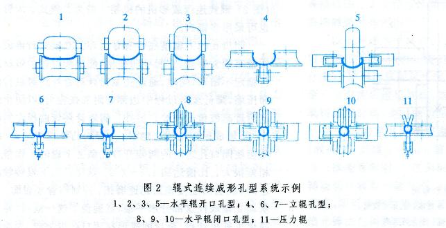 (1)輥式成形。是將帶材在多機(jī)架的輥式連續(xù)成形機(jī)上,按照一定的孔型系統(tǒng)逐漸連續(xù)彎曲成要求形狀和規(guī)格的管筒(見帶材成形孔型設(shè)計(jì))的變形過程。(圖2)輥式連續(xù)成形機(jī)的機(jī)架一般為二輥式,大管徑也可采用多輥式。