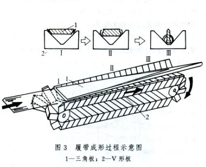 (3)履帶成形。是排輥連續(xù)成形方法在小型管材生產(chǎn)中的發(fā)展,成形過程如圖3所示。它是將排輥群進(jìn)一步密集化,變成上下兩塊成形板,上板俯視為三角形,帶材入口處寬,管筒出口處窄,三角形板的橫斷面形狀按成形規(guī)律要求設(shè)計(jì)。下板由橫斷面為V形槽的履帶鏈塊拼成,隨著履帶由帶材入口向管筒出口方向運(yùn)轉(zhuǎn),帶材被帶入變形區(qū),連續(xù)彎曲成形。管筒出口段的三角板橫斷面設(shè)計(jì),還可以考慮對(duì)成形管筒底部給予一定的壓縮量,以求帶材的側(cè)邊與中底部的延伸平衡,使焊縫附近不產(chǎn)生波紋。此法生產(chǎn)的管材外徑為20~50mm,壁厚0.5~3.5mm,壁厚與外徑比達(dá)到1/100。