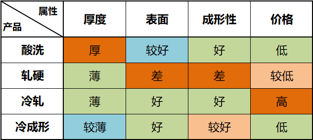 酸洗、軋硬、冷軋產品是傳統生產工藝中不同階段的產物,酸洗是熱軋去氧化皮的產品,軋硬是冷軋退火前的產品。