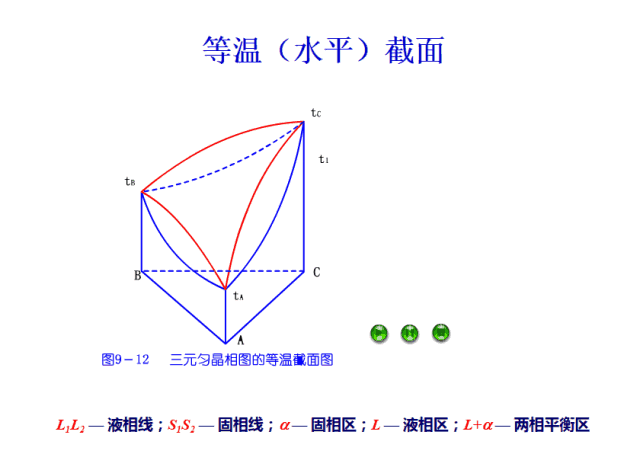 液固兩相共存區(qū)L+α:abc黃色面和藍(lán)色面之間區(qū)域。