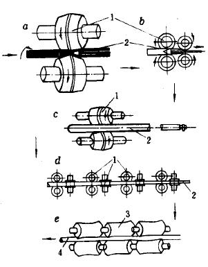 a-軋輥平立交錯布置的連續軋制 b-軋輥按不同交角布置的連續軋制