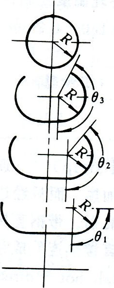 圓周彎曲法(圖b)。在每架成形機上管坯全寬同時以不同的曲率半徑進行彎曲變形。曲率半徑按變形均勻分配配原則逐架遞減。管坯邊緣與曲率半徑中心連線的夾角叫中心角。中心角小于180。時上下全寬接觸變形。中心角大于180。和小于270.時,上輥與管坯中段,下輥與管坯全寬接觸變形.中心角大于270.后,管坯進入上輥帶導向環的閉口孔型,漸成管筒.