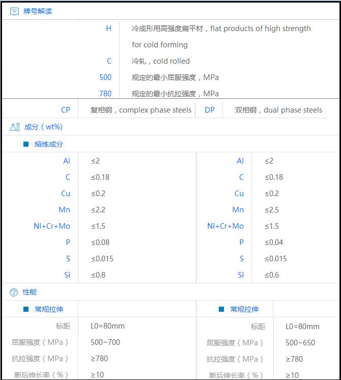 如,HC500/780DP和HC500/780CP這兩個牌號,雖然力學性能非常接近,但是由于鋼種不同,內部組織也不同。僅根據質保書信息判斷,使用DP鋼來替代CP鋼的話,容易在加工過程中出現翻邊開裂的問題。