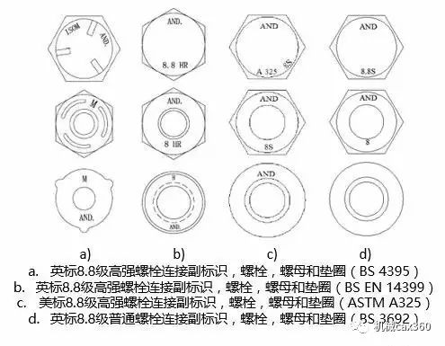 普通螺栓和高強螺栓的標示是對同等級螺栓現場識別的基本方法。由于英美標準中對于高強螺栓扭矩值計算的取值并不相同,所以識別兩種標準的螺栓也有必要。