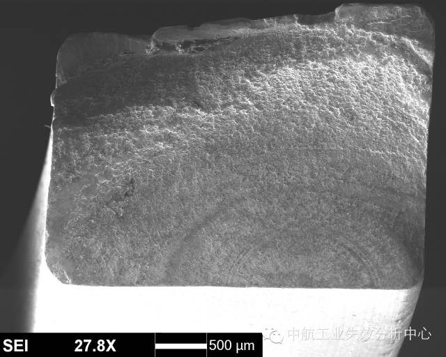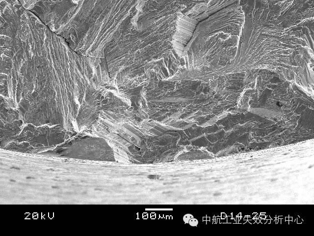 這類的源區(qū)附近斷面由于交錯分布多個解理面,因此比較粗糙,之后的疲勞擴展前、中期則會轉為平坦,最后失穩(wěn)后的快速擴展又重新變得起伏大和粗糙。此外,有些疲勞并不一定從試樣表面起源,有可能在試樣內(nèi)部,此時往往可能由于內(nèi)部存在缺陷或亞表面處于特殊應力狀態(tài)導致。