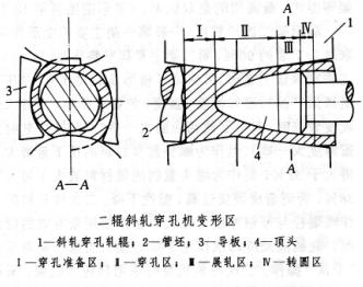 二輥斜軋穿孔機(jī)的變形區(qū)大致可分為4個(gè)區(qū)域(見(jiàn)圖)。I區(qū)主要作用是為穿孔做準(zhǔn)備和順利地實(shí)現(xiàn)一、二次咬入(見(jiàn)斜軋穿孔原理)。由于軋輥入口錐表面有錐度,沿穿孔方向(軸向)前進(jìn)的管坯逐漸在徑向受壓縮,被壓縮部分的金屬一部分向橫向(導(dǎo)板方向)流動(dòng),使坯料斷面由圓形變成橢圓形,而表層金屬向軸向延伸,因此在坯料前端會(huì)形成一個(gè)喇叭口狀的凹陷,此凹陷和定心孔一起保證了穿孔時(shí)頂頭鼻部對(duì)準(zhǔn)坯料中心,以減小毛管前端的壁厚不均。