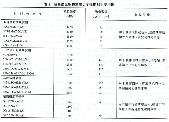 在合金結構鋼的基礎上發展起來的一種高強度、高韌性合金鋼。通常把抗拉強度在1500MPa以上,或者屜服強度在1380MPa以上,并具有足夠的韌性和良好的工藝性能的合金鋼稱為超高強度鋼。主要用于航空和航天工業制作承受高應力的重要結構部件。按照化學成分和使用性能特點可劃分6大類別:(1)低合金超高強度鋼。(2)二次硬化超高強度鋼。(3)馬氏體時效鋼。(4)超高強度不銹鋼。(5)基體鋼。(6)相變誘導塑性鋼。