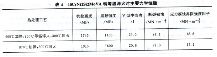 等溫淬火是經常采用的一種超高強度鋼熱處理工藝。采用不同的等溫溫度可獲得下貝氏體或下貝氏體與馬氏體混合組織。這種顯微組織在受力條件下裂紋在邊界形核并穿過晶體擴展,當經過界面時裂紋擴展改變方向,使消耗能量增多,斷裂韌性提高。如表4所示,40CrNi2Si2MoVA鋼采用250~300℃等溫淬火,斷裂韌性提高23%,應力腐蝕界限強度因子提高10%。