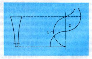 換能器中流過(guò)的電流是激勵(lì)電流I和極化電流I0之和。I0是直流電源e提供的恒定常量,激勵(lì)電流I是正弦交變量。電抗器Lc對(duì)I0的阻力很小,而對(duì)I的阻力很大,耦合電容C只允許I通過(guò),而不允許I0通過(guò),所以換能器中流過(guò)的電流是I和I0。I0在換能器鐵芯內(nèi)產(chǎn)生極化磁場(chǎng),I產(chǎn)生激勵(lì)磁場(chǎng)。聚能器為一圓錐體,其長(zhǎng)度按振幅分布使端點(diǎn)具有最大的振幅和最小的應(yīng)力(圖5)。