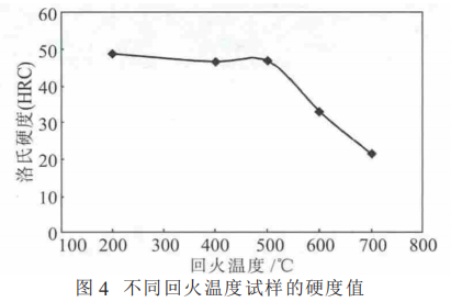 保持試樣的奧氏體化工藝一定 (1050 ℃-60min),當試樣經200~700℃回火60min后,各試樣的硬度如圖4所示。從圖4中可看出,當試樣的回火溫度為 200~400℃時,試樣的硬度值輕微下降;在400~500℃回火溫度內,材料的硬度小幅度提高,這可以歸因于二次硬化現象,通常與馬氏體板條內的M7C3碳化物的形成有關。在500~700℃的回火溫度范圍內,材料的硬度大幅度下降,這種軟化行為的發生是由于材料組織中的M7C3碳化物開始粗化并部分轉變為M23C6碳化物。