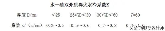 工件在水一油雙介質淬火時,在水中停留時間: t (s) =K*D, 式中的D為工件最易開裂出的厚度,K為常數。