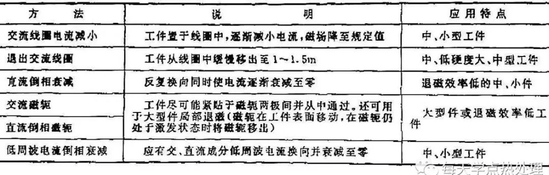 檢測過程中,若有前次磁化的殘留剩磁可能會影響磁痕痕跡。因此,在兩次連續操作之間應對被檢工件做退磁處理。檢測后不允許有剩磁的被檢物也必須退磁處理。退磁法方法列于表5。