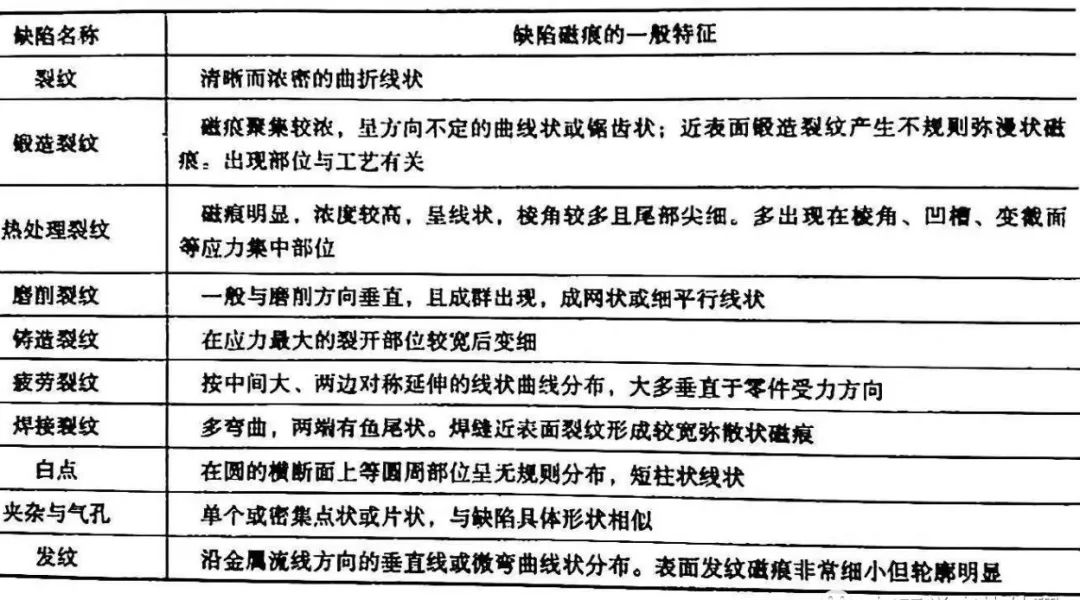 表6 為各種缺陷磁痕一般特征。