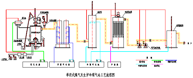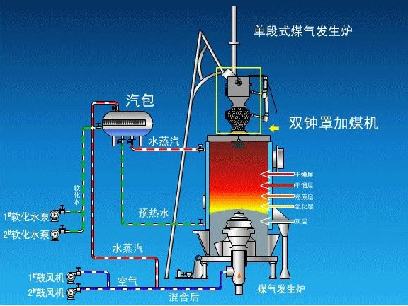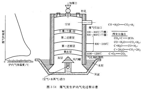 發生爐中引入單一空氣所產煤氣為空氣發生爐煤氣,它發熱量低(3760~4600kJ/m3;爐子的燃燒層溫度高,爐襯易損壞,熱損失大,灰渣易熔堵爐柵。引入單一水蒸氣的發生爐為水煤氣發生爐,所產水煤氣發熱量較高(10000~11300kJ/m3),但由于水煤氣反應吸收大量熱量,需周期性地引入空氣,制氣過程是非連續性的。因此,一般煤氣發生爐均引入空氣和水氣的混合物,所產生的混合發生爐煤氣的發熱量也不高(5018~6690kJ/m3)。
