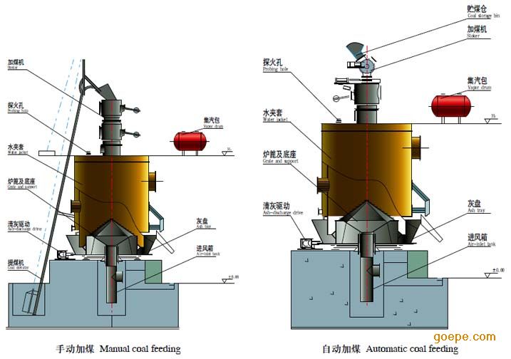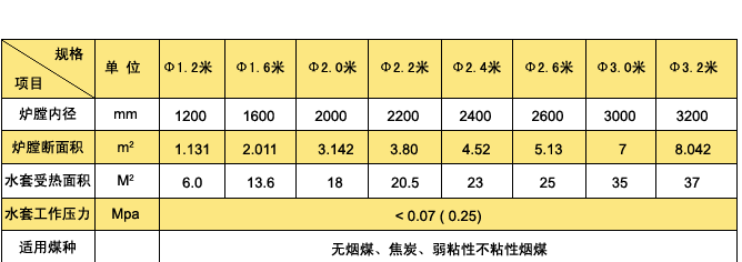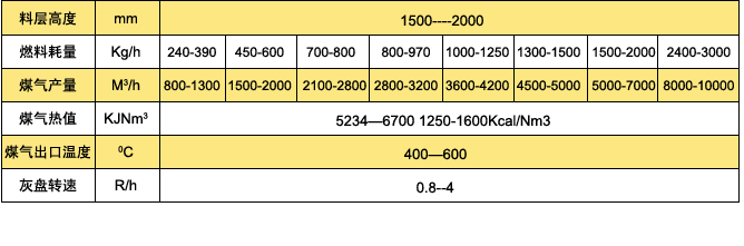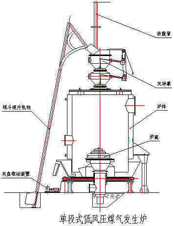 該爐型為全水套結構,雙鐘罩加煤,濕式灰盤出渣,爐體高度低,煤氣出口壓力較低,操作簡單。水夾套自 產蒸汽足夠氣化使用。爐體有常壓(A型)和承壓(B型)兩種結構,用戶在定貨時根據自身情況選定。