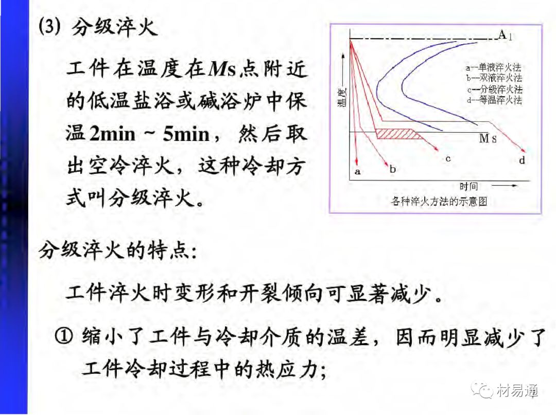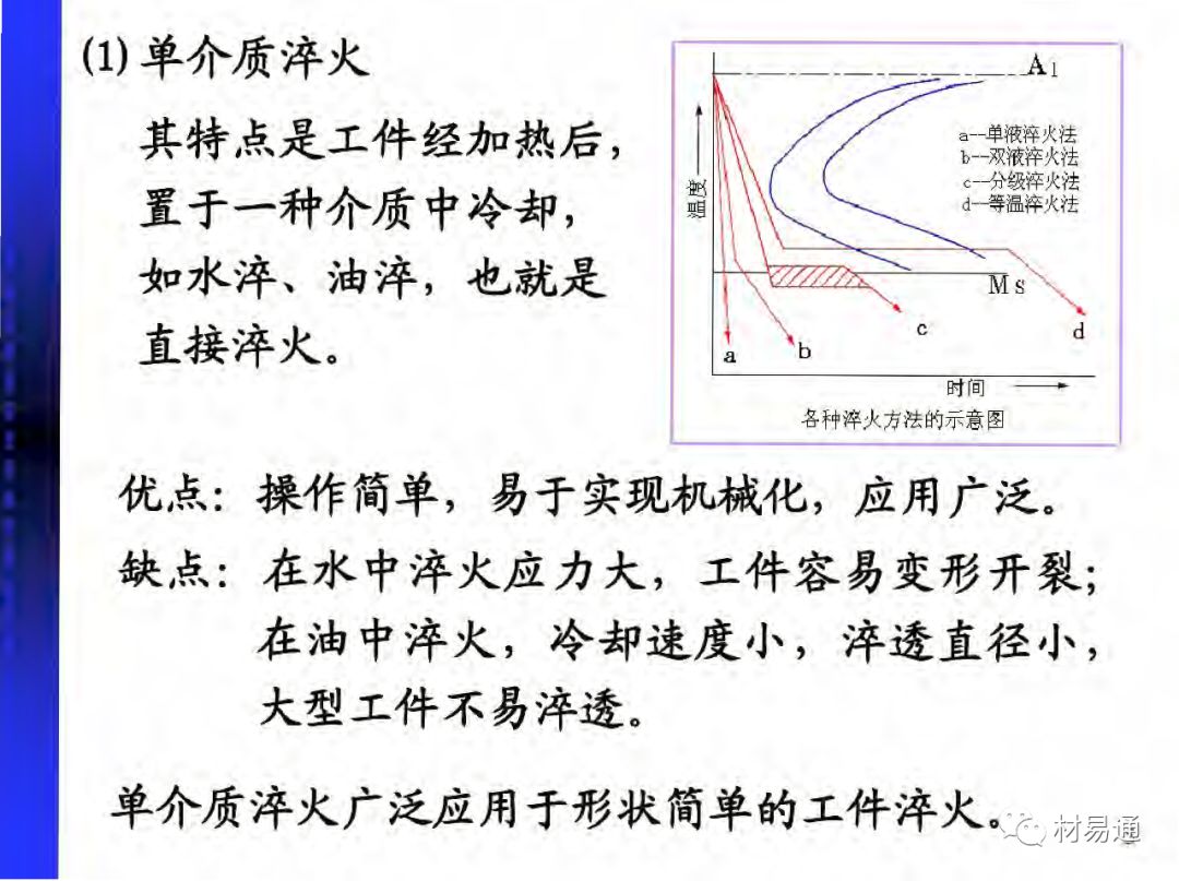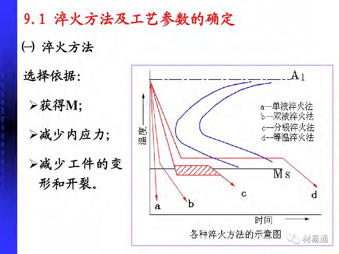 將鋼加熱到Ac3(亞共析鋼)或Ac1(過共析鋼)以上(30~50)℃某一溫度,保持一定時(shí)間,然后在水或油中快速冷卻的操作工藝稱為淬火。