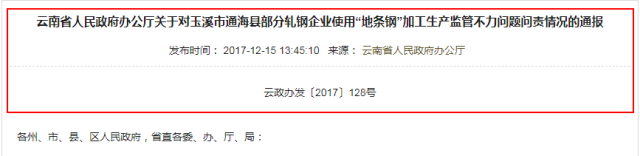 12月15日,云南省人民政府網(wǎng)站發(fā)布《關(guān)于對(duì)玉溪市通??h部分軋鋼企業(yè)使用“地條鋼”加工生產(chǎn)監(jiān)管不力問(wèn)題問(wèn)責(zé)情況的通報(bào)》?!锻▓?bào)》指出,2017年7月份,玉溪市通??h部分軋鋼企業(yè)出現(xiàn)使用“地條鋼”加工生產(chǎn)的問(wèn)題。為此,云南省委、省政府決定對(duì)8個(gè)責(zé)任單位和部門、11名責(zé)任人進(jìn)行問(wèn)責(zé)。