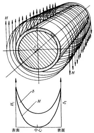 當交變電流在導體中通過時,在所形成的交變磁場作用下,導體內會產生感應電動勢。由于越接近心部,感應電動勢越大,導體的電流便趨向于表層,電流強度從表面向心部呈指數規律遞減,如圖1 所示。這種現象即所謂交變電流的集膚效應。