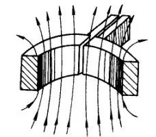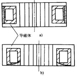 加熱外表面,環狀效應是有利的,而加熱平面與內孔時,它會使感應器的電效率顯著降低。為了提高平面和內孔感應器的效率,常常設置導磁體,以改變磁場強度的分布,迫使電流趨近于零件所需加熱的表面,見圖4 。由圖可見,導磁體有把電流驅向其對側的作用。