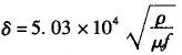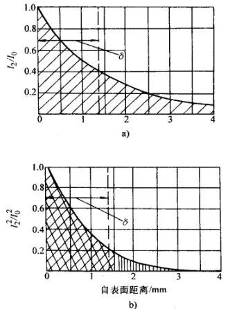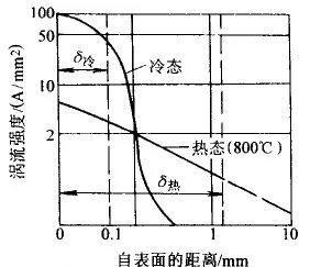磁場強度分布的基本方程表明,渦流強度隨表面距離的變化呈指數規律。渦流高度集中在表層中,它隨距離的增大而急劇下降。在工程應用中,規定 Ix 降至表面的 1/e (e=2.718) 處為電流透入深度,并用δ表示。如果 ρ 的單位為 Ω·cm ,則可用下式求 δ(mm)