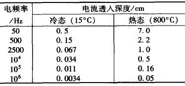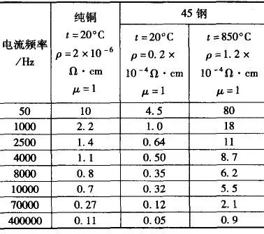 表2 和表3 列出了在各種頻率下的電流在純銅與45鋼冷態與熱態中的渦流透入深度。