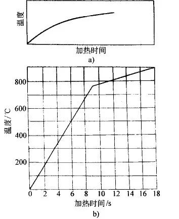 ▲圖12 w(C)0.85%的鋼在各種加熱速度下的溫度-時間曲線