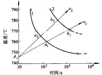 在連續加熱的條件下,珠光體向奧氏體轉變動力學也可用圖3 來說明。由A1 點出發的不同仰角的射線表示相變區的各種不同的加熱速度。他們分別與曲線1和曲線2相交于 a1、b1......和a2、b2......顯然,加熱速度越大(v2v1),進行相變的溫度就越高,而所需要的的時間就越短。