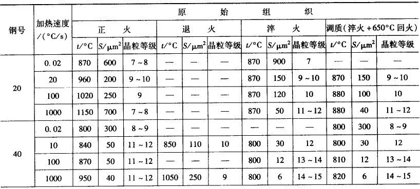 在生產中采用大于3~10℃/s 的加熱速度可得到11~12 級的奧氏體晶粒。如果要得到 14~15 級的超細晶粒,必須先進行淬火或調質處理以消除自由鐵素體,并采用高達100~1000℃/s 的加熱速度。