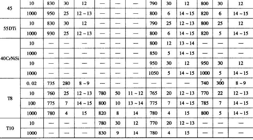 實踐證明,對具有均勻分布的鐵素體和滲碳體組織的鋼進行快速加熱時,當加熱速度由0.02℃/s 增高到100~1000℃/s 時,初始奧氏體晶粒度由 8~9級細化到 13~15 級。加熱速度為10℃/s 時初始奧氏體晶粒度為11~12 級。要得到14~15級的超細化晶粒必須采用100~1000℃/s 加熱速度,見表6 。