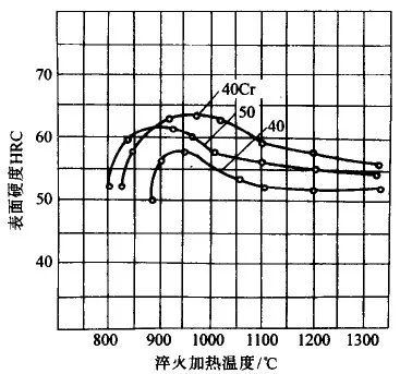 對相同材料,經過感應加熱表面淬火(噴射冷卻)后,其硬度比普通加熱淬火的高2~6HRC(見圖17)。這種現象稱為 “超硬度”。