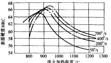 感應加熱表面淬火時,在一定的加熱速度下,可在某一相應的溫度下獲得最高硬度,見圖15 。提高加熱速度,這一溫度向更高的方向推移,見圖16 。