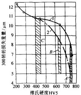 零件工作時的磨損量在很大程度上取決于硬度。對同樣的材料,高頻淬火零件的耐磨性比普通淬火零件高得多(見圖18)。
