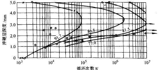 ▲圖19 含碳0.74%鋼在各種表面淬硬層深度時對應的疲勞斷裂次數