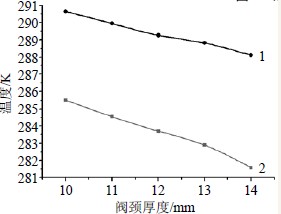 圖3 長頸部壁厚對填料函溫度場的影響