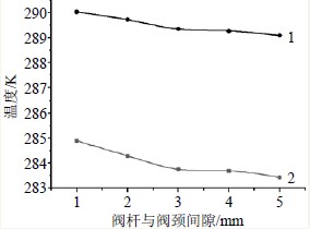 圖4 長頸閥蓋與閥桿間隙對填料函溫度場的影響