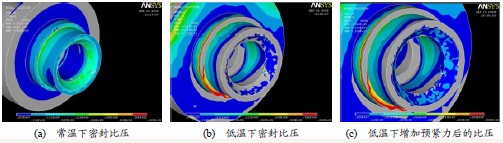 4)由于低溫引起密封面的變形,可能會發生常溫下密封良好的閥座在低溫狀態下發生泄漏,為此在計算密封預緊力時,在滿足許用比壓的基礎上,應適當增加超低溫閥門的閥座預緊力,建議增加30%左右。圖6為球閥密封座密封比壓的仿真應力圖,仿真結果顯示-196℃低溫時,增加30%的預緊力才能符合密封要求。