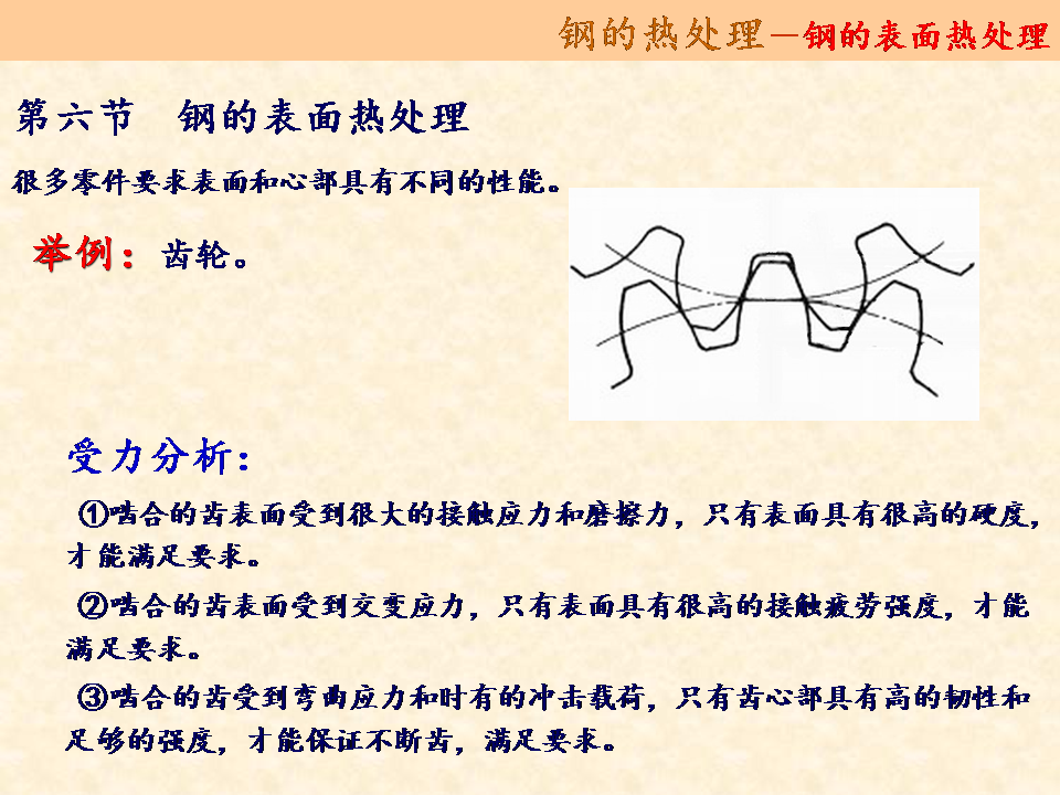 機(jī)器零件如齒輪,曲軸工件條件不同,有時(shí)受沖擊,表面受摩擦,要求芯部有足夠強(qiáng)度,韌性,表面有高的硬度和耐磨性。