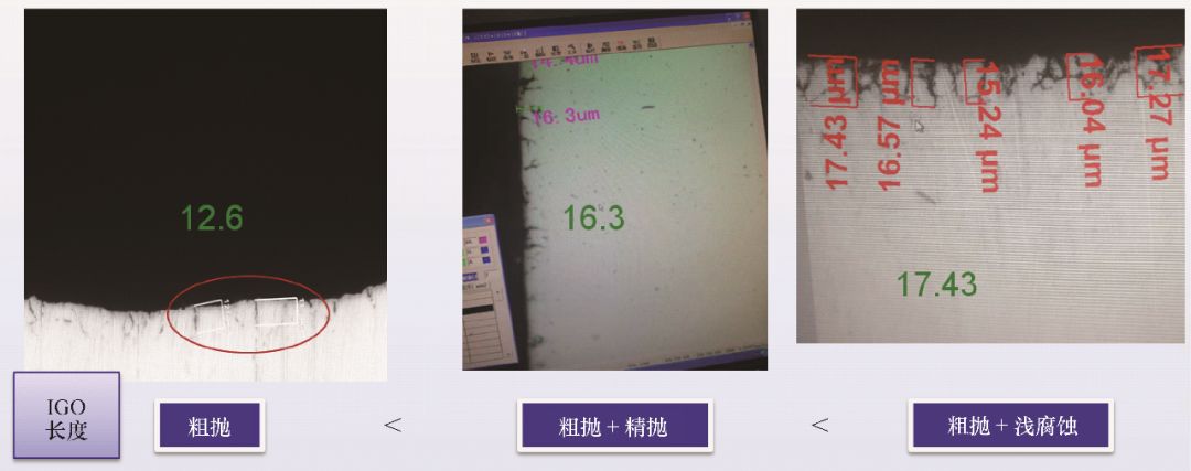 從英文翻譯來(lái)看“非馬”是一種組織,事實(shí)上也的確是如此,需要腐蝕才能看出來(lái),且淺腐蝕足矣。IGO是種氧化物,原則上不需要腐蝕,不過(guò)制樣很關(guān)鍵,精拋后的長(zhǎng)度(在500×)與僅粗拋后的長(zhǎng)度差距很大,一般國(guó)內(nèi)制樣應(yīng)用最多的是顆粒度為5μm的拋光劑(粗拋),有些外企(ZF)是用粗拋(5μm)+精拋(0.05μm),也有些企業(yè)使用了粗拋+淺腐蝕。圖1所示為同一樣塊采用的不同方法制樣。