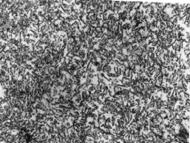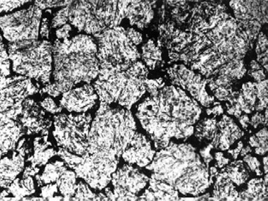 C、回火索氏體:是高溫回火(500~650℃)組織。回火索氏體是鐵素體與較粗的粒狀滲碳體所組成的機械混合物。碳鋼回火索氏體中的鐵素體已經(jīng)通過再結(jié)晶,呈等軸細晶粒狀。經(jīng)充分回火的索氏體已沒有針的形態(tài)。在大于500倍的光鏡下,可以看到滲碳體微粒(如圖10所示)。回火索氏體具有良好的綜合機械性能。