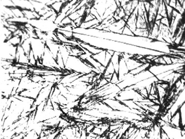 (4)馬氏體(M):是碳在a-Fe中的過飽和固溶體。馬氏體的形態(tài)按含碳量主要分兩種,即板條狀和針狀(如圖6、圖7所示)