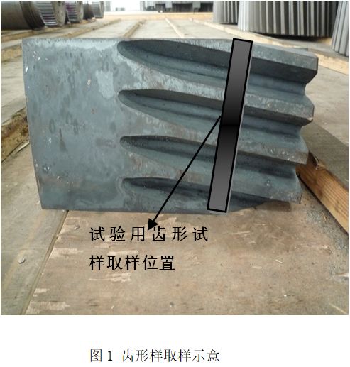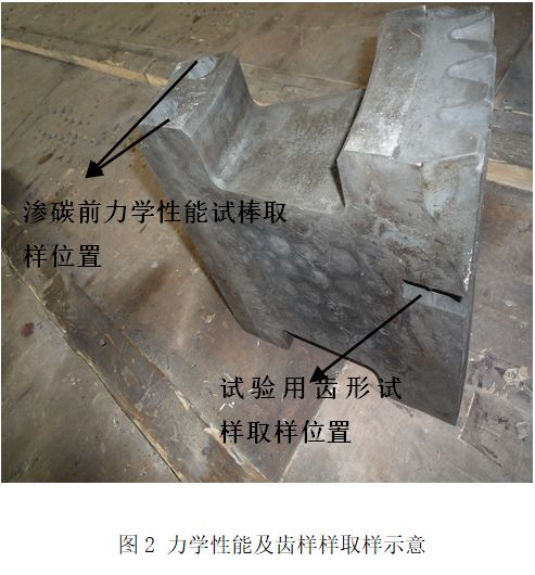 試驗(yàn)試樣取材于20CrMnMo材質(zhì)實(shí)體齒輪,模數(shù)12,通過(guò)線切割獲得4件齒形樣坯,滲碳前在齒形樣坯上制取力學(xué)性能試樣,試驗(yàn)每組試樣包括齒形樣坯1件、力學(xué)性能試棒2件,獲得4組滲碳淬火試樣;滲碳淬火后再?gòu)凝X形樣坯齒寬中部法向截面上取得試驗(yàn)用齒形試樣;最終每組檢測(cè)樣品包括齒形樣1件、偽滲碳力學(xué)性能試棒2件。試樣取樣位置如圖1、圖2所示。
