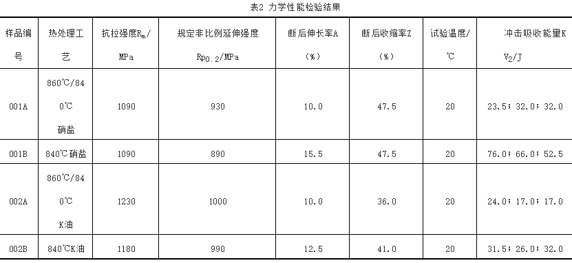 (1)相同材質(zhì)及淬火溫度工藝,油淬的強(qiáng)度指標(biāo)高于鹽淬,但塑韌性低于鹽淬。如表2所示,強(qiáng)度指標(biāo)提高10%左右,但沖擊功降低40%左右。