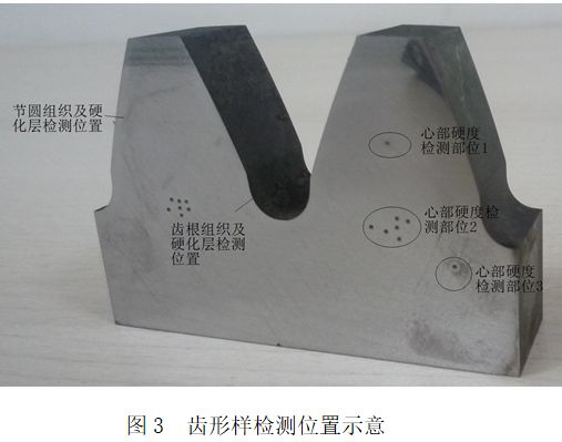 ③心部硬度檢測(cè)部位3:法向截面上,齒根30°切線方向,深度為1倍模數(shù)處。