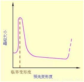 (2)預先變形度  變形度的影響主要與金屬變形的均勻度有關。變形越不均勻, 再結晶退火后的晶粒越大。變形度很小時,因不足以引起再結晶,晶粒不變。當變形度達到2~10%時,金屬中少數晶粒變形,變形分布很不均勻,所以再結晶時生成的晶核少,晶粒大小相差極大,非常有利于晶粒發生吞并過程而很快長大,結果得到極粗大的晶粒。使晶粒發生異常長大的變形度稱作臨界變形度。生產上應盡量避免在臨界變形度范圍內的塑性變形加工。超過臨界變形度之后,隨變形度的增大,晶粒的變形更加強烈和均勻,再結晶核心越來越多,因此再結晶后的晶粒越來越細小。但是當變形度過大(約≥90%)時, 晶??赡茉俅纬霈F異常長大,一般認為它是由形變織構造成的。