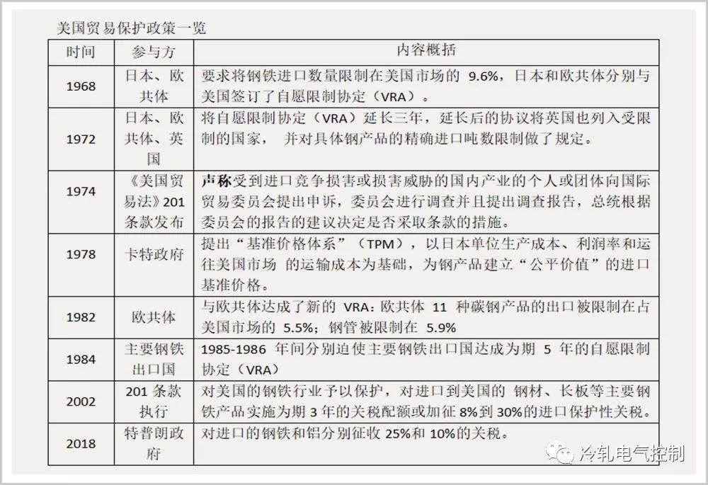 自愿限制協定(VRA),限制進口的國家覆蓋面逐步擴大、限制進口的數量、品種逐步明晰;基準價格體系(TPM),明晰基準價格,低于基準價格進入美國市場將自動引發一個由政府主導的反傾銷調查。