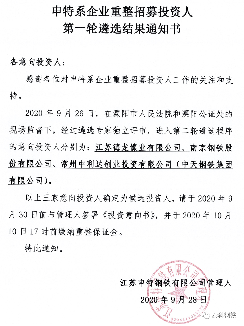 2020年9月26日,在溧陽市人民法院和溧陽公證處的現場監督下,經過遴選專家獨立評審,進入第二輪遴選程序的意向投資人分別為:江蘇德龍鎳業有限公司、南京鋼鐵股份有限公司、常州中利達創業投資有限公司(中天鋼鐵集團有限公司)。
